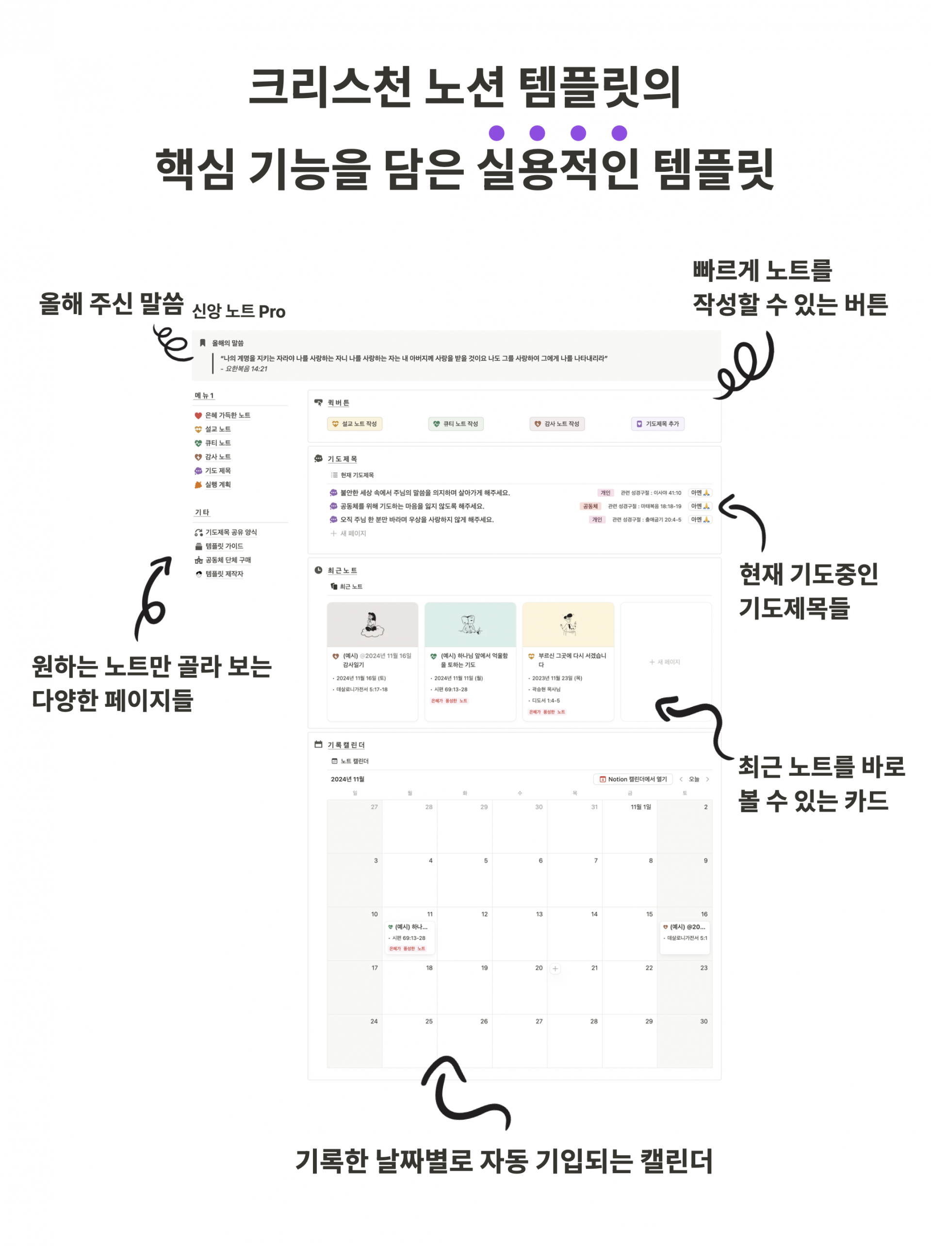크리스천 노션 사용자를 위한 에센셜 템플릿! 설교, QT, 감사 노트부터 기도제목까지 가장 기본적인 기능을 가득 담았습니다.
